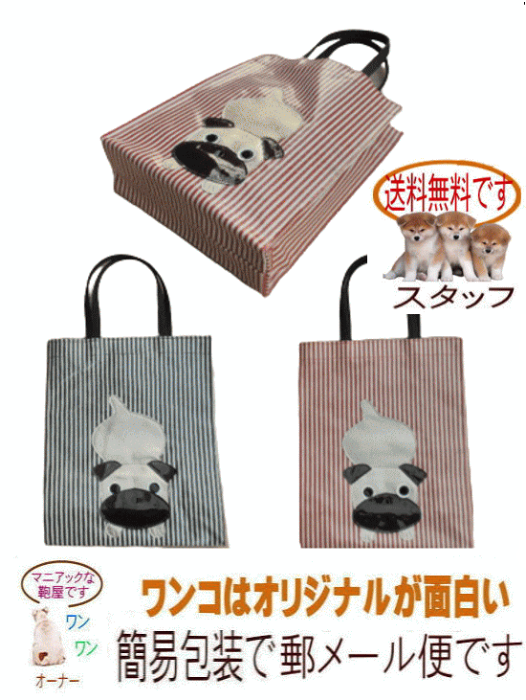 素材 コットンにビニールコーティング 内ポケット あり カラー 原産国 日本製 サイズ 持ち手周囲:34cm 持ち手幅:1,5cm 上部幅:24cm 高さ:32cm 底マチ:8cm 底幅:24cm デザインのコンセプトとしてはパグが尻尾を振ってじゃれついているシーンを抜き取った物です。