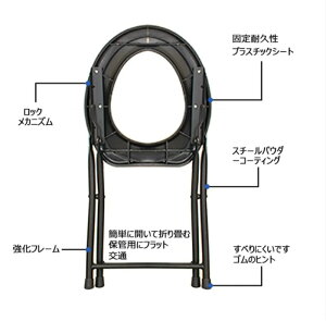 【使用サイズ】(約)35×36×76.5cm【収納サイズ】(約)66×35cm【便座穴サイズ】(約)24×21cm【耐荷重】(約)150kg【材質】便座/ポリプロピレン、脚/スチール(エポキシ粉体塗装)、滑り止めキャップ/ポリプロピレン【生産国】中国【特徴】軽量で持ち運べる椅子です。