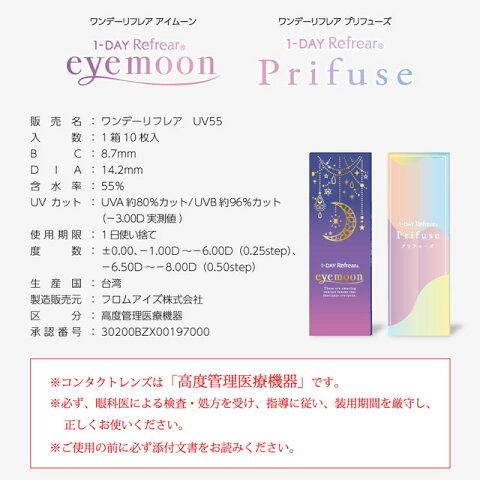 ■販売名:ワンデーリフレア UV55 ■内容:1箱10枚入り ■装用期間:1日使い捨て ■BC:8.7mm ■度数:±0.00、-1.00~-6.00(0.25ステップ)、-6.50~-8.00(0.50ステップ) ■カラー:ピーチクラウズ、ミッドナイト、ドリームブラウン、ピンク_ブルー、ネイビー_オレンジ、ブラウン_コーラル ■DIA:14.2mm ■着色直径:13.0mm ■含水率:55% ■特徴:UVカット(UV-A約80%、UV-B約96%カット)、うるおい成分配合 ■販売元:フロムアイズ株式会社 ■製造販売元:フロムアイズ株式会社 ■医療用具承認番号:30200BZX00197000 ■区分:高度管理医療機器(台湾製) <コンタクトレンズご購入に関する遵守事項> ●コンタクトレンズは高度管理医療機器です。