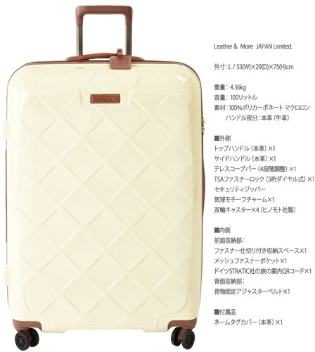 商品番号 No.3-9902/9894-75 /商品名:レザー アンド モア/L サイズ 外寸:53(W)×29(D)×75(H)cm:空港カウンター受託手荷物 重量:4.36kg 容量:100リットル 【参考情報】レザー&モアS/M/Lはネスティング(入れ子)保管が可能 カラー ・ブラック (JAN:4001807342856) ・シャンパン (JAN:4001807342870) ・ダークグリーン (JAN:4001807342863) ・ネイビーブルー (JAN:4001807343259) ・カーマイン・レッド (JAN:4001807343266) ・ミルク (JAN:4001807343273) ブラック/ダークグリーン/カーマインレッドには細かなラメが入っています(ご覧頂いているブラウザや画面設定によって多少実物の色目と異なって見える場合もございます) 素材 100%ポリカーボネート(コベストロ社マクロロン)ハンドル部分:本革(牛革) 原産国 中国(企画デザイン:ドイツ) 仕様 ■外側 トップハンドル(本革)×1 サイドハンドル(本革)×1 テレスコープバー(キャリーバー:4段階調整)×1 TSAファスナーロック(3桁ダイヤル式)×1 セキュリティジッパー 気球モチーフチャーム×1 本体一体型リベット×4 双輪キャスター×4(ヒノモト社製Lisof搭載) ■内側 前面収納部: ファスナー仕切り付き収納スペース×1 メッシュファスナーポケット×1 ドイツSTRATIC社の旅の案内QRコード×1 背面収納部: 荷物固定アジャスターベルト×1 ■付属品 ネームタグカバー(本革)×1 取扱い説明書(日本語)とTSAロック使用方法(日本語)は商品に付随しています CHECK! ◇当店取り扱いのSTRATIC商品は全て国内正規品です。