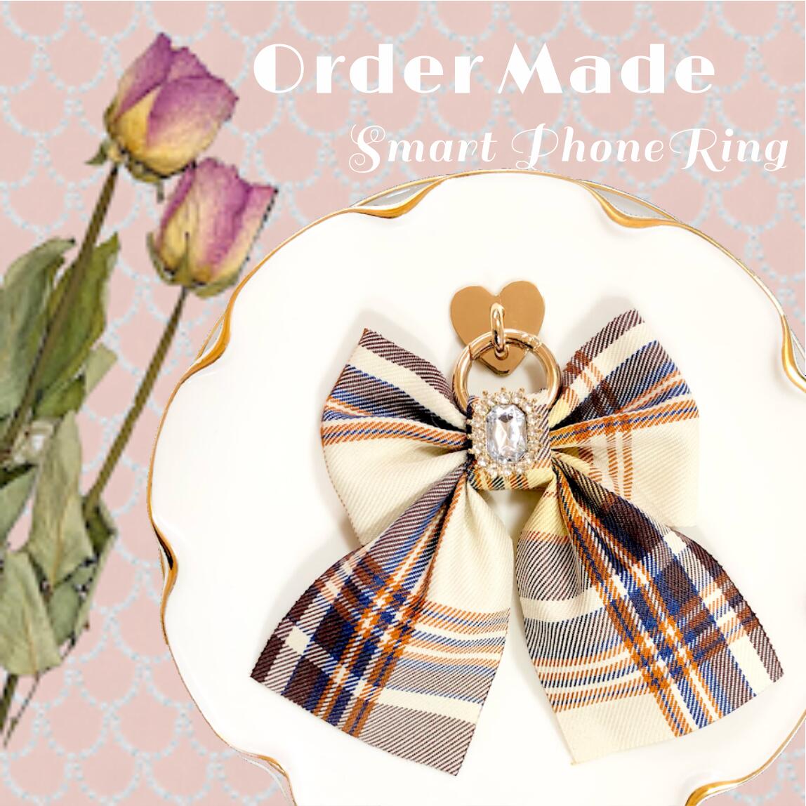 スマホ リング チェックリボン クリーム スマホ リング オーダーメイド iphone 全機種 韓国 シンプル おしゃれ かわいい 人気 カラビナ ホルダー バンカーリング 落下防止 フィンガーリング リボン スマホアクセサリー 【送料無料】