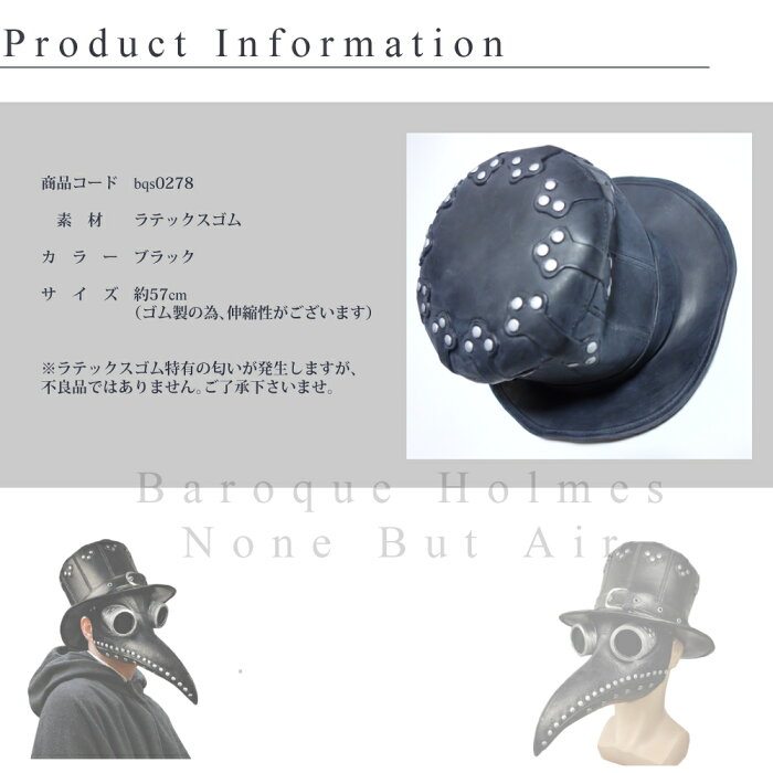商品コード:bqs0278 サイズ:フリーサイズ (約57cm) 素材:ラテックスゴム カラー:画像参照 ◆ペスト医師やスチームパンク系のコスプレにうってつけのゴム製の黒いハット ◆金属などは使われておらず、すべてゴム製なので、カバンに忍ばせる等、とても持ち運び安いのがポイントです ※ラテックスゴム特有の匂いが発生しますが、不良品ではありません。