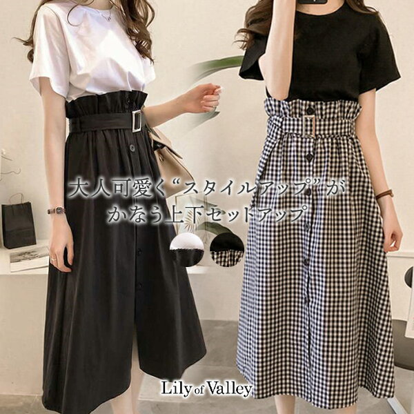 /セットアップ チェック柄 ミモレ丈 白 黒 レディース トップス カットソー ワンピース バイカラー ・ 大人可愛いTシャツ+フロントボタンロングスカートの2点セットが入荷♪